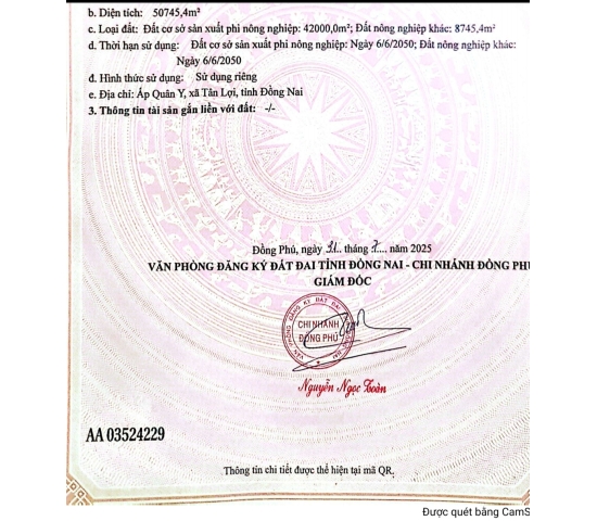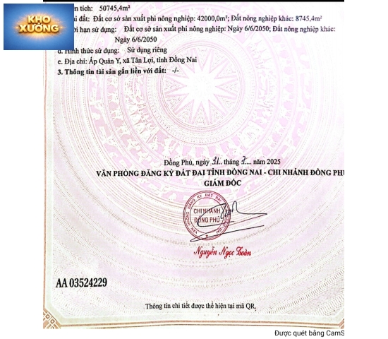 Tổng DT đất 6,3 mẫu SkC 4,5 mẫu trả tiền 1 lần đến 2050. Đường nhựa xe công điện ngây đất. Cách KCN Bắc Đồng Phú 1,5 km.