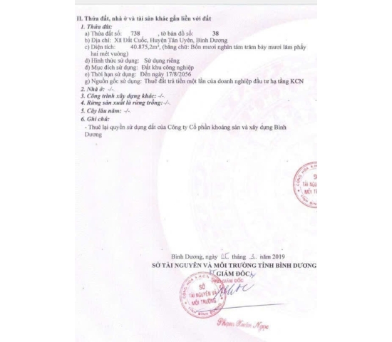 Diện tích đất 40.875 m2 SKK trả tiền 1 lần. Kính gửi Quý khách hàng xây dựng xưởng cho thuê hoặc sản xuất và quý doanh nghiệp nước ngoài. Thu hút đầu tư nhiều ngành nghề như ximạ.gỗ. cơ khí.v..v. giá 160 usd/m2
