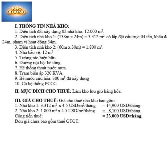 Cho thuê nhà xưởng trong KCN Bình Dương cũ DT đất 10.000m2 xưởng 4,100m2 giá 4,5 USD M2. Cọc 6 tháng. Pccc tự động. Có cẩu trục. Giấy phép đầu tư nước ngoài OK