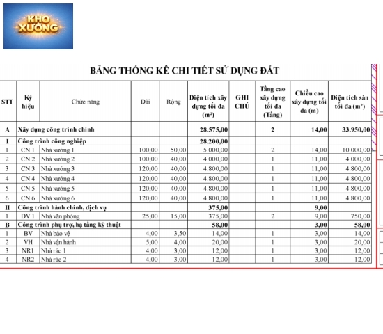 - Nhà xưởng 1: 100 x 50 = 5.000 mét vuông
