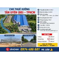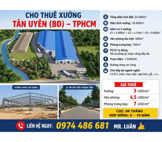 CHO THUÊ XƯỞNG TÂN UYÊN (BD) TPHCM Tổng diện tích đất 24.000m2 Diện tích xưởng 18.400m2 Gồm có 3 xưởng X1= 5.680m2 + X2= 4.116m2 + X3= 9.800m2 Văn phòng lầu trệt 300m2 Phòng trưng Bày 700m2 PCCC tự động. Hồ sơ pháp lý, hoàn công đầy đủ. Trạm điện 1.500kva đường nhựa xe công Chủ tiếp đa ngành nghề . Cơ khí .sofa .mai mặc . Ngu kim .gỗ ..v..v.. Giá thuê xưởng 3usd/m2 Văn phòng 4,5usd/m2. Phòng trưng bài 7usd/m2 cọc 06 tháng, hợp đồng 5-10 năm LH 0974486681 Mr luân 🤙