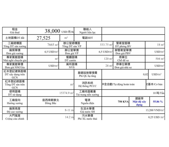 Tổng diện tích 12.000m2 diện tích nhà xưởng 7.665m²diện tích văn phòng533,75m²giá thuê nhà xưởng 4.5USD/m2. Cọc 6 tháng. Giấy tờ đầy đủ xưởng mới 100%. Đầu tư nước ngoài OK. Tiếp nhiều ngành nghề