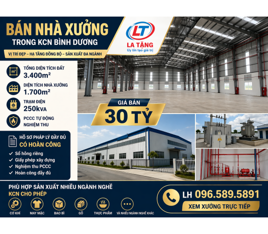 Bán nhà xưởng trong KCN Bình Dương - Tổng diện tích đất 3.400m2 - Diện tích nhà xưởng 1.700m2 - Trạm điện 250kva - Pccc tự động nghiệm thu Hồ sơ pháp lý đầy đủ có hoàn công Phù hợp sản xuất nhiều ngành nghề KCN cho phép 💵Giá bán 30 tỷ LH 096.589.5891 xem xưởng