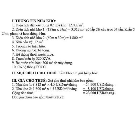 Diện tích:1000m2 Giá 55tr/ tháng. 500m2 giá 25tr/ tháng